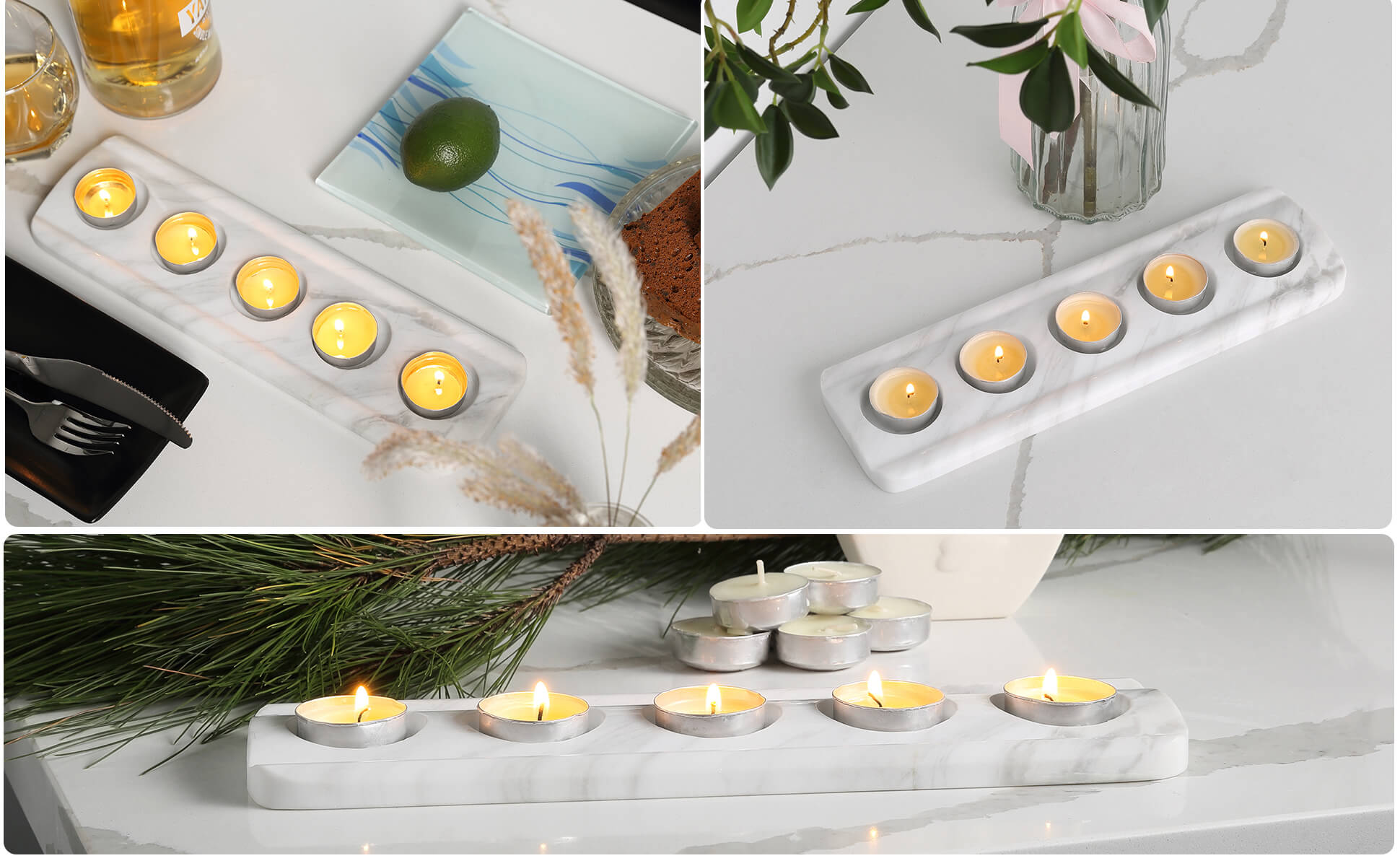 5-Hole Design: Light up five candles to bring more brightness and warmth to your fireplace, bookshelf, or table, offering comfort and relaxation after a busy day. The 1.7" (4.5cm) diameter hole is designed to securely hold most tealight candles.