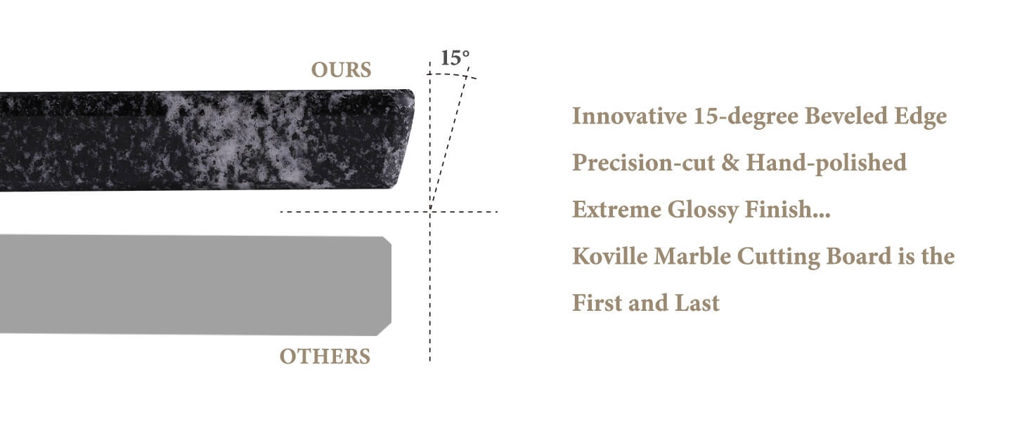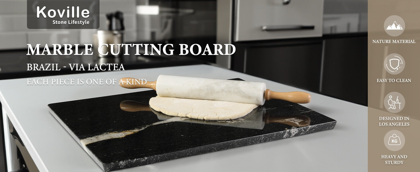 CRAFTED 15°BEVELED-EDGE: Koville marble cutting board for kitchen is crafted with innovative polished beveled edge, not only enhances the aesthetics of the board but also serves a functional purpose. The beveled edges provide a comfortable grip and make lifting and moving the board a breeze.