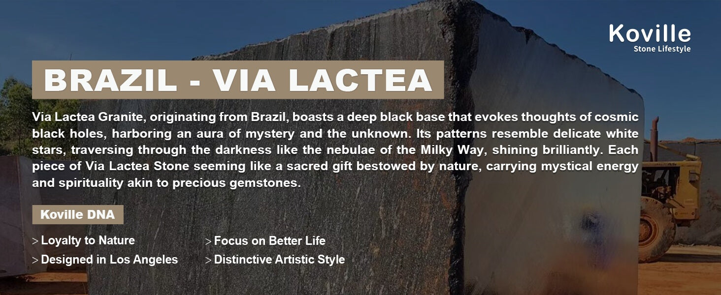 BRAZIL-VIA LACTEA: Via Lactea Granite, originating from Brazil, boasts a deep black base that evokes thoughts of cosmic black holes, harboring an aura of mystery and the unknown. Its patterns resemble delicate white stars, traversing through the darkness like the nebulae of the Milky Way, shining brilliantly. Each piece of Via Lactea Stone seeming like a sacred gift bestowed by nature.