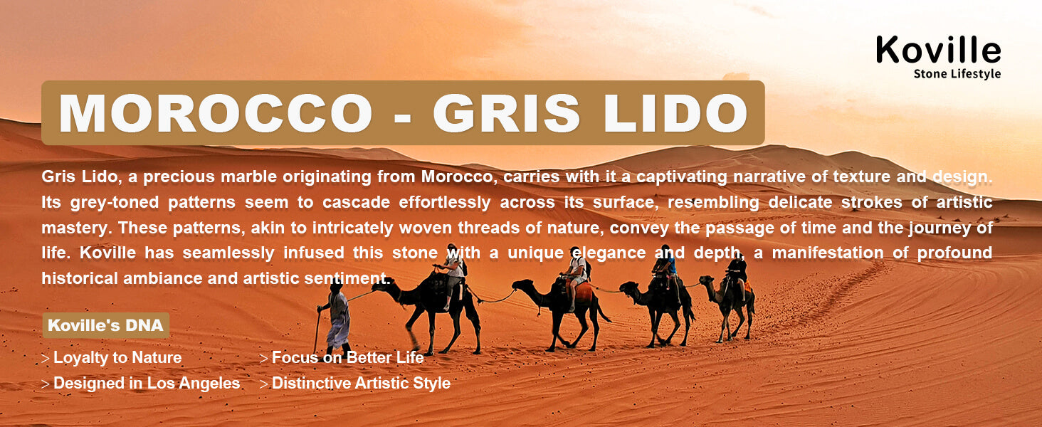 Luxury Natural Marble: Gris Lido, a precious marble originating from Morocco, carries with it a captivating narrative of texture and design. Its grey-toned patterns seem to cascade effortlessly across its surface, resembling delicate strokes of artistic mastery. Each piece is ONE-OF-KIND art.