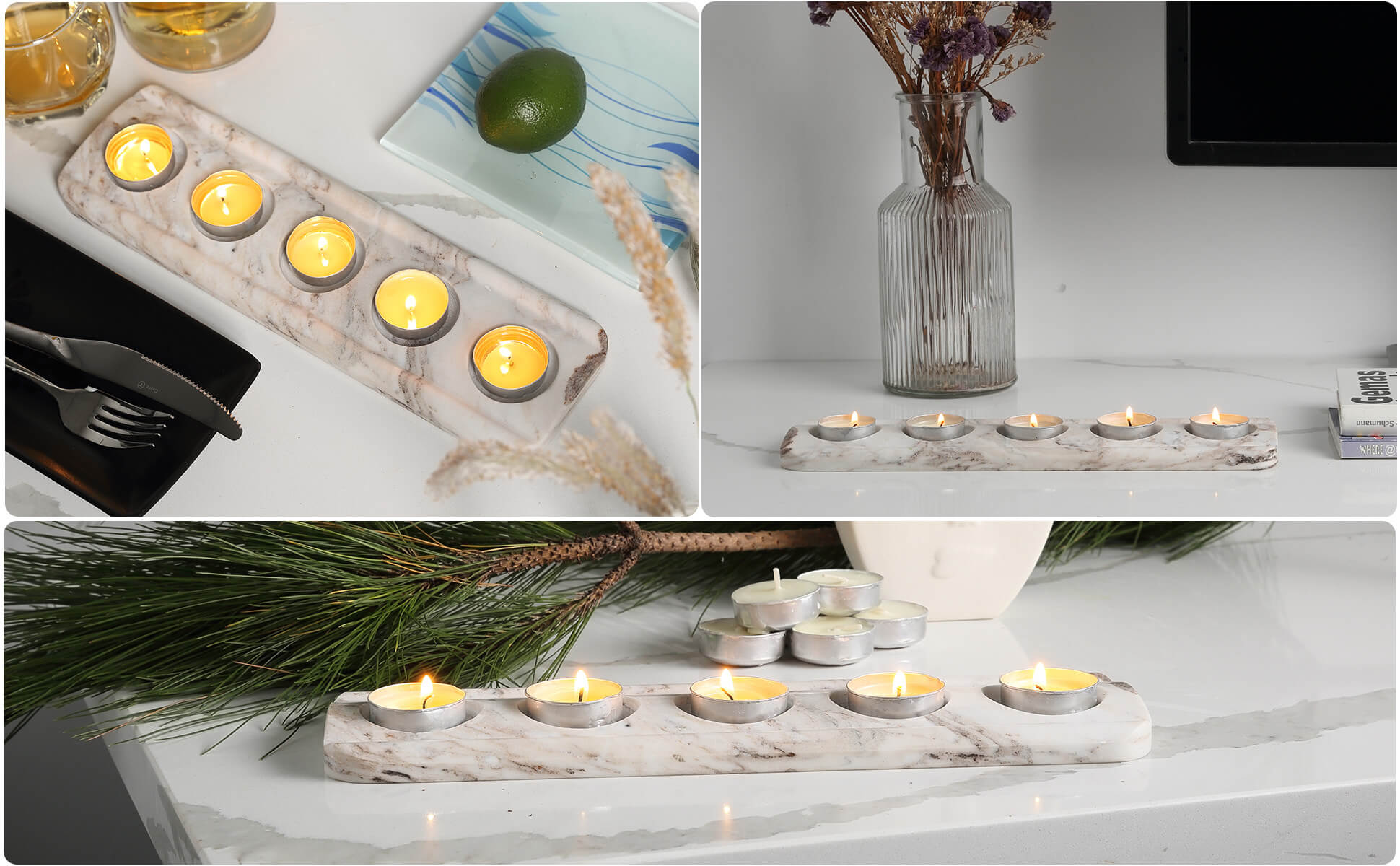 5-Hole Design: Light up five candles to bring more brightness and warmth to your fireplace, bookshelf, or table, offering comfort and relaxation after a busy day. The 1.7" (4.5cm) diameter hole is designed to securely hold most tealight candles.