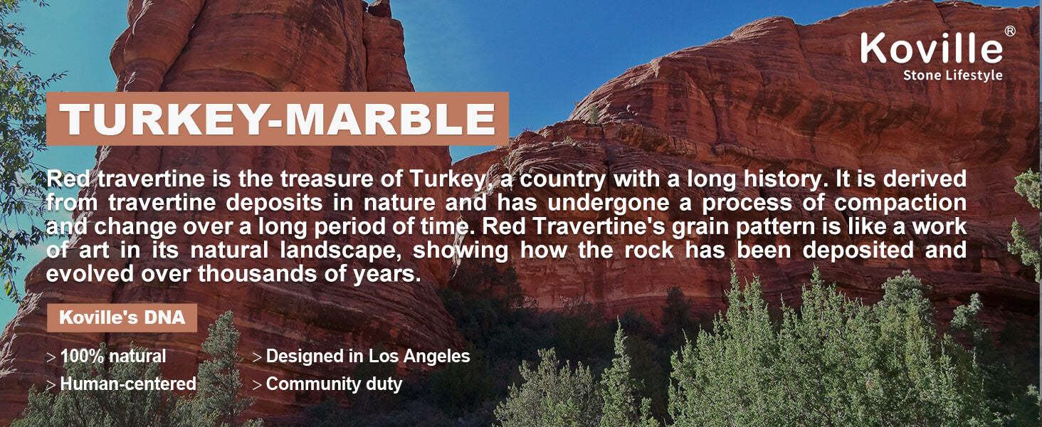 Turkey Red Travertine: Red travertine is the treasure of Turkey Dcountry with a long history.It`s derived from trayertine deposits in nature and has undergone process of compaction and change over a long periodoftime.Red Travertine's grain pattern is like a work of artin its natural and scape, showing how the rock has been deposited and evolved over thousands of years