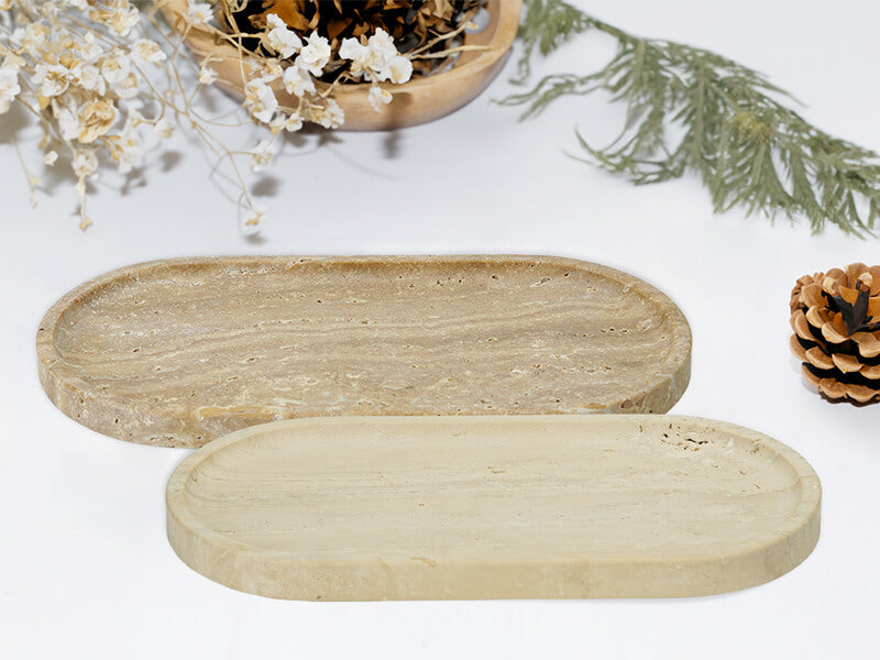 Meticulously hand-polished by skilled craftsmen, our travertine oval tray embodies the unique charm of the stone's natural pores.