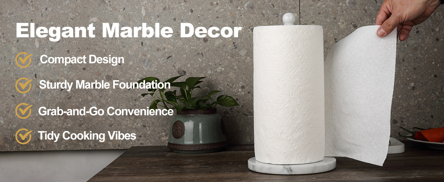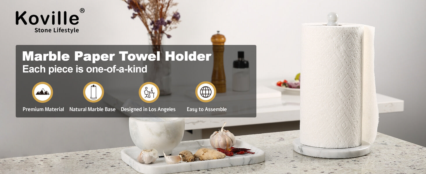 Sturdy and Durable: Koville’s high quality paper towel holder(4.29pounds), the upgraded base(7.9") is made of heavy marble polished, smooth and delicate touch surface, keep the paper towel holder super sturdy and won't tip over.