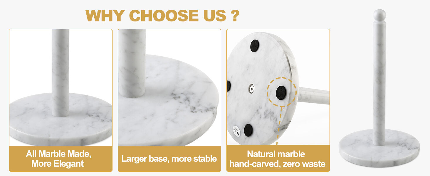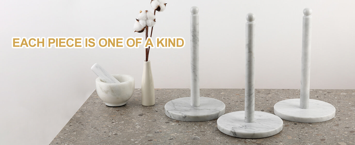 Each Piece is Unique: The base of the paper towel holder is composed of pure natural marble, Bianco Carrara. The stone natural pure texture, white and flawless, with rich white crystals , like glazed white jade. Because the distribution of natural stone crystals and veins are presented differently, so that each piece becomes unique.
