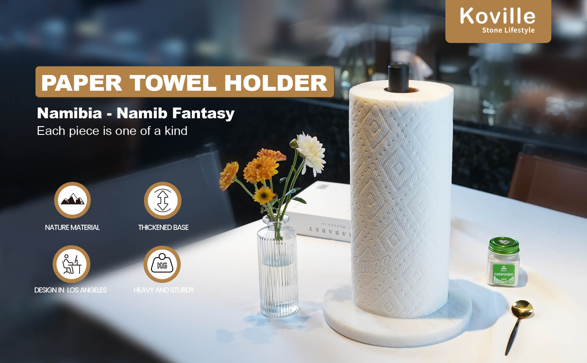 Sturdy and Stable: Koville high-end paper towel holder(4.29lb), the thickened marble base(7.9") provides an unmatched stability. Smooth and delicate touch surface, Placing in space of any countertop can set off a modern, stylish aesthetic.