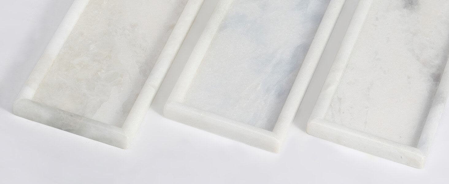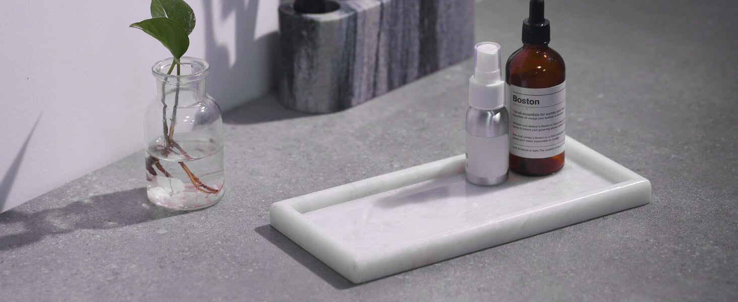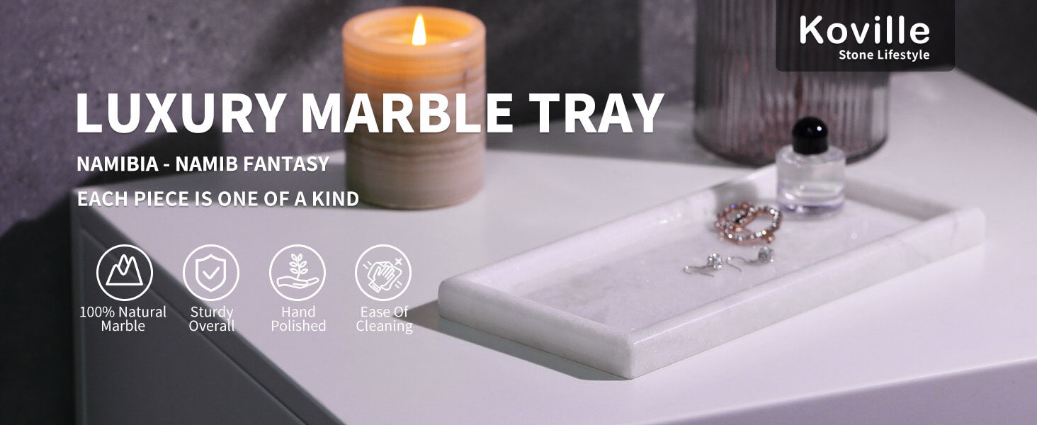 PRACTICALITY & ELEGACE: Koville 10"x5" natural marble Bathroom Countertop Tray is durable. It is not only the best match for practical storage, but also a beautiful decoration for modern homes. Because the different distribution of natural stone crystals, each piece is one of a kind.