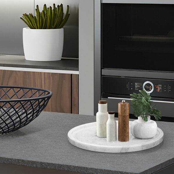 Upgrade your kitchen with our versatile marble round tray. Crafted from natural stone, it offers a chic and practical solution for organizing your kitchenware. From spices to utensils, this tray adds a touch of luxury to your culinary space while keeping everything within easy reach.