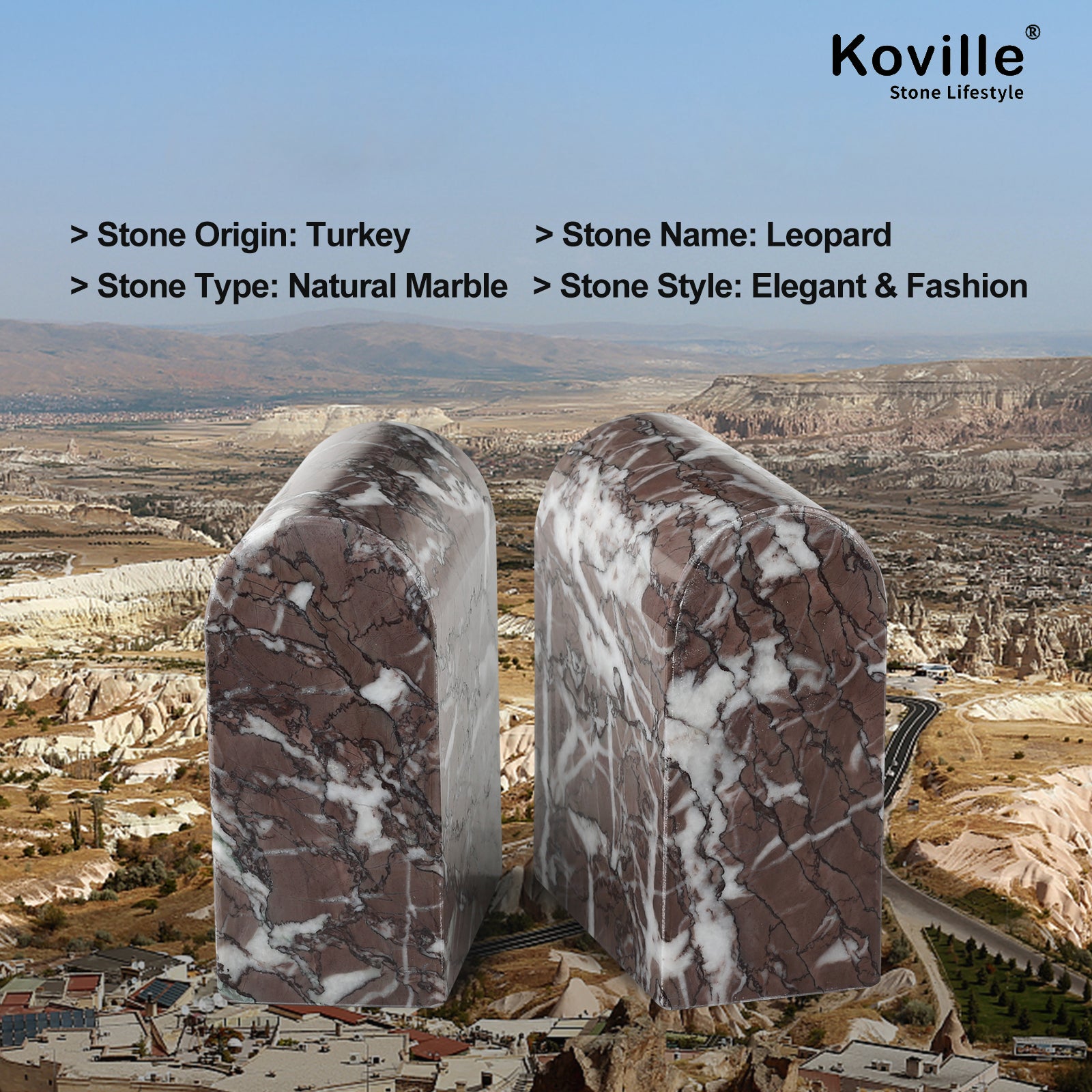 Luxurious Leopard Marble: The Koville natural marble triumphal arch Bookend SE is made of rare leopard marble, which is sourced from Turkey's rich, storied lands. This marble features a captivating blend of light lake blue and gentle purple, reminiscent of lilac blooms in the morning dew. Each natural vein is like a masterpiece, showcasing the intricate beauty of nature. The sterile, odorless, and harmless rarity of this stone makes it a stunning blend of art and nature, adding timeless elegance to your decor.