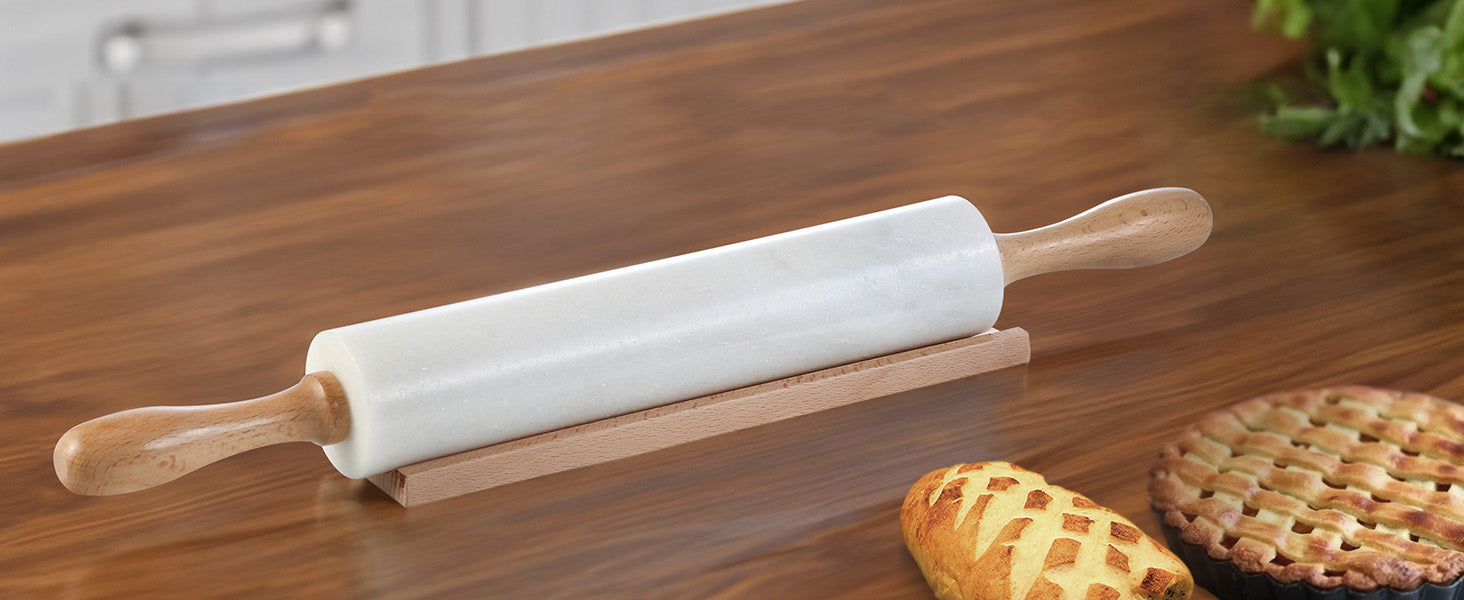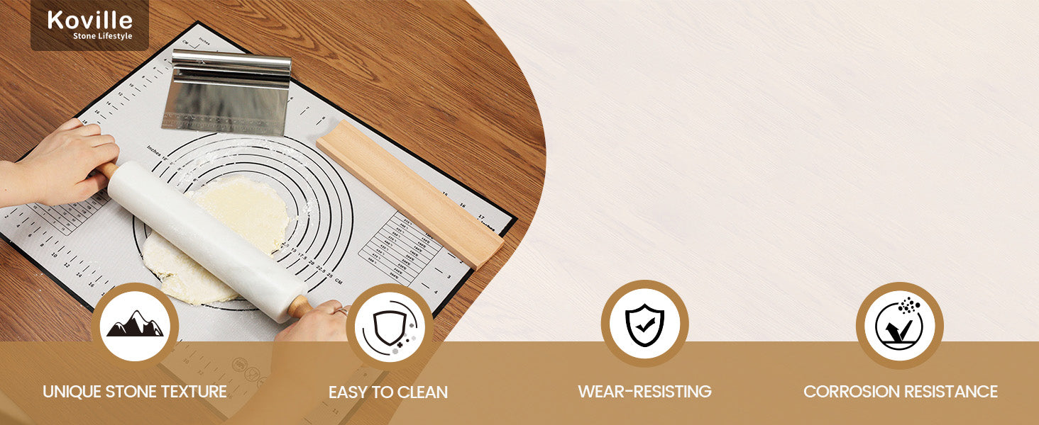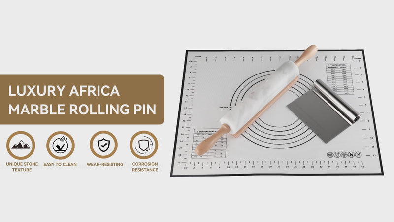 Complete Rolling Set for Convenience: This natural marble rolling pin comes with a practical wooden base, ensuring that your rolling pin is securely stored when not in use. The wooden base also serves as a stable platform during preparation, preventing the rolling pin from rolling away. This complete set also includes a scraper and dough mat, making it an essential addition to any baker’s kitchen.