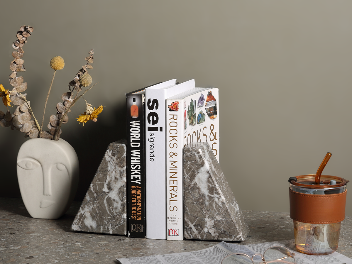 Timeless Craftsmanship with Natural Marble: The Koville natural marble trapezoid bookend is crafted from premium Gris Lido marble, sourced from Morocco. Each piece boasts a stunning polished finish and unique gray-toned veins. These natural veins tell a story of timeless elegance, ensuring every bookend is a one-of-a-kind masterpiece that enhances the aesthetic of your space.