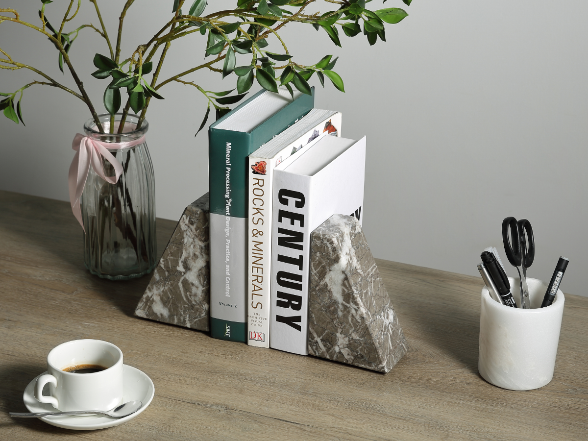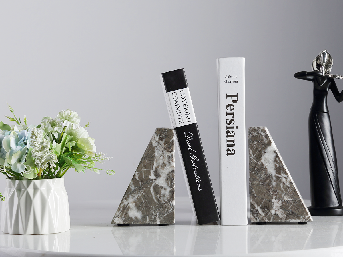 Durable and Stain-Resistant Material: Built from high-quality sterile, odorless, and harmless marble, these bookends are naturally resistant to stains and wear. The durable stone composition ensures they maintain their beauty and functionality over time. Whether displayed in a home library or an office, the natural marble Trapezoid Bookend remains a practical yet sophisticated decor choice that complements any bookshelf.
