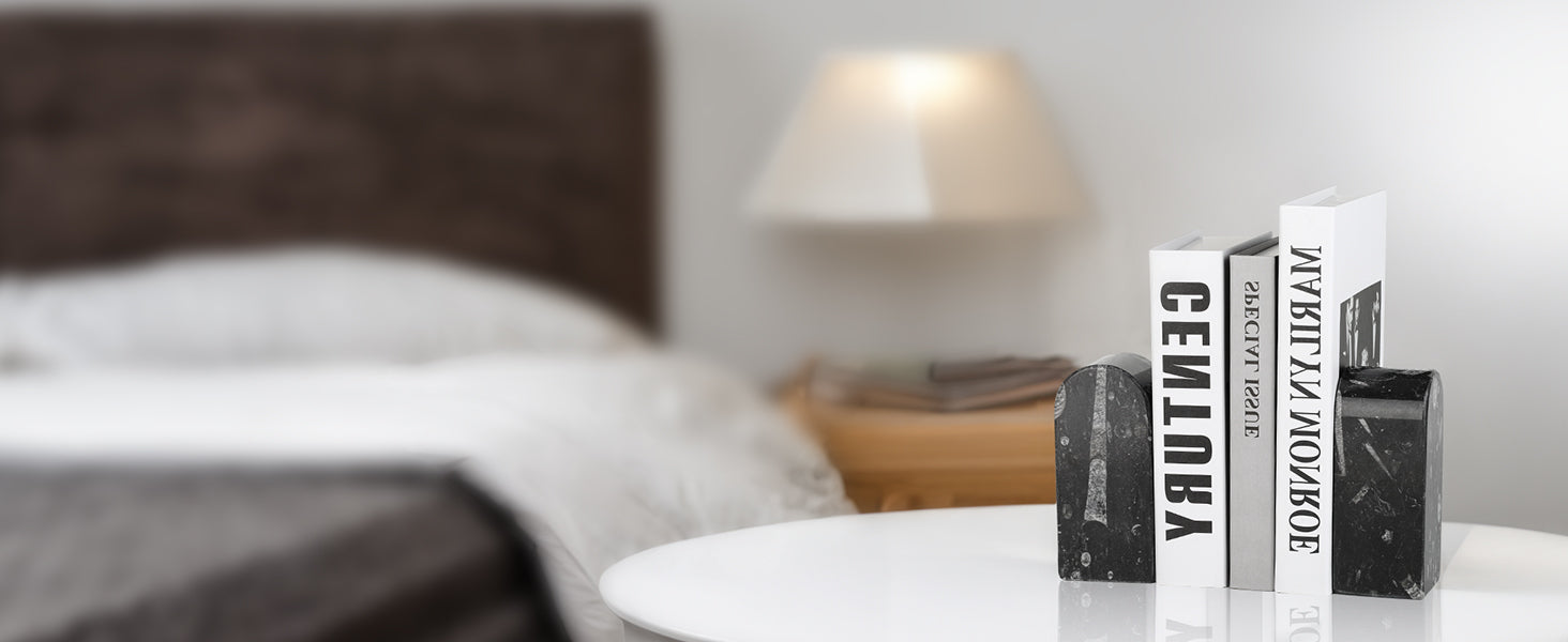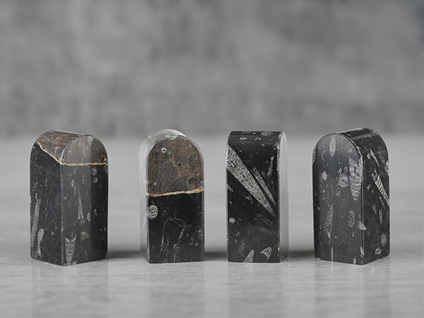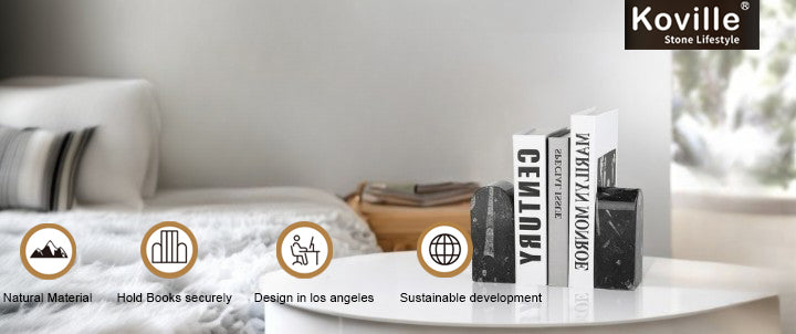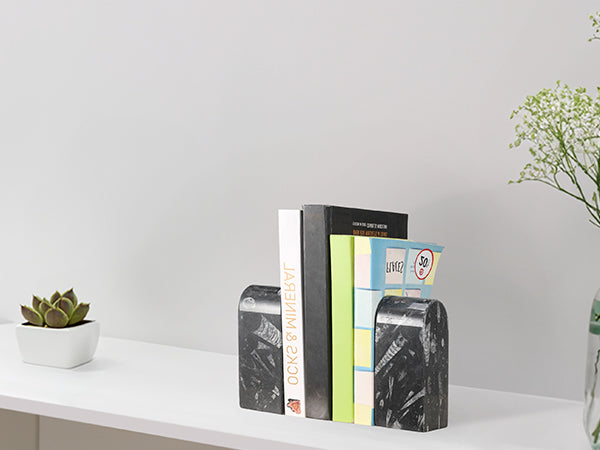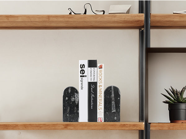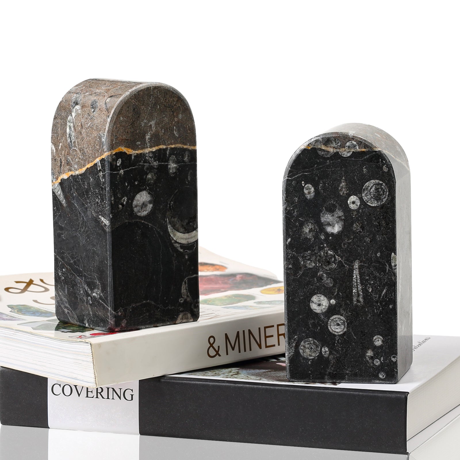 Timeless Black Fossil Marble: The Koville natural marble Triumphal Arch bookend medium is expertly made from Morocco natural Black Fossil marble, this natural marble showcases the ancient history of Morocco. This exquisite stone contains preserved fossils, making each bookend not just functional, but a true piece of history, adding a timeless touch to any bookshelf.